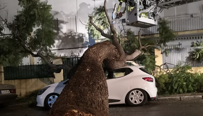 En concreto, según han informado Bomberos Jerez, se han desplazado nueve bomberos y tres vehículos para intervenir tras la caída del árbol, que se ha arrancado de cuajo del suelo.