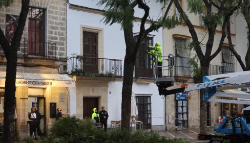 Los Bomberos han tenido que acudir a la calle Sancho Vizcaíno, donde se había caído una cornisa, para retirar los restos de la misma y asegurar la zona.