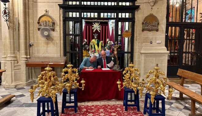 El acuerdo se firmó en la capilla de San Marcos, donde se expone el misterio completo de la Cena. En el acto participaron el hermano mayor jerezano, Manuel Muñoz Natera, y su homólogo del Museo, Ángel Casal García, sellando una colaboración que permitirá que las piezas jerezanas luzcan en uno de los actos más relevantes del calendario cofrade hispalense.