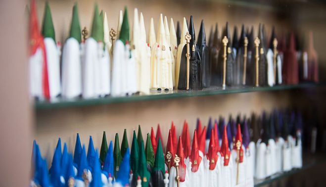 "Los americanos siempre nos preguntan si los penitentes que tenemos en el expositor son del Ku Klux Klan", señala Adolfo Quevedo con sorna. Sus monumentales y pequeñas figuras de fiestas religiosas no pasan desapercibidas. Su ubicación, en plena plaza de la Yerba, el corazón de la ciudad, permite que no haya prácticamente jerezano que no conozca Casa Quevedo. Su enorme cantidad de imágenes para el Belén y religiosas llaman la atención de cualquier turista extranjero, de ahí la pregunta que todos los estadounidenses formulan al propietario, ya jubilado, de esta mítica tienda de Jerez. Se ha convertido en emblema de la ciudad por su historia, por ser una de los primeros negocios de Jerez de este tipo: casi 70 años anclado en una de las esquinas más transitadas del casco histórico, y por su trabajo artesanal dedicado a la instalación de cristalería y marquetería.