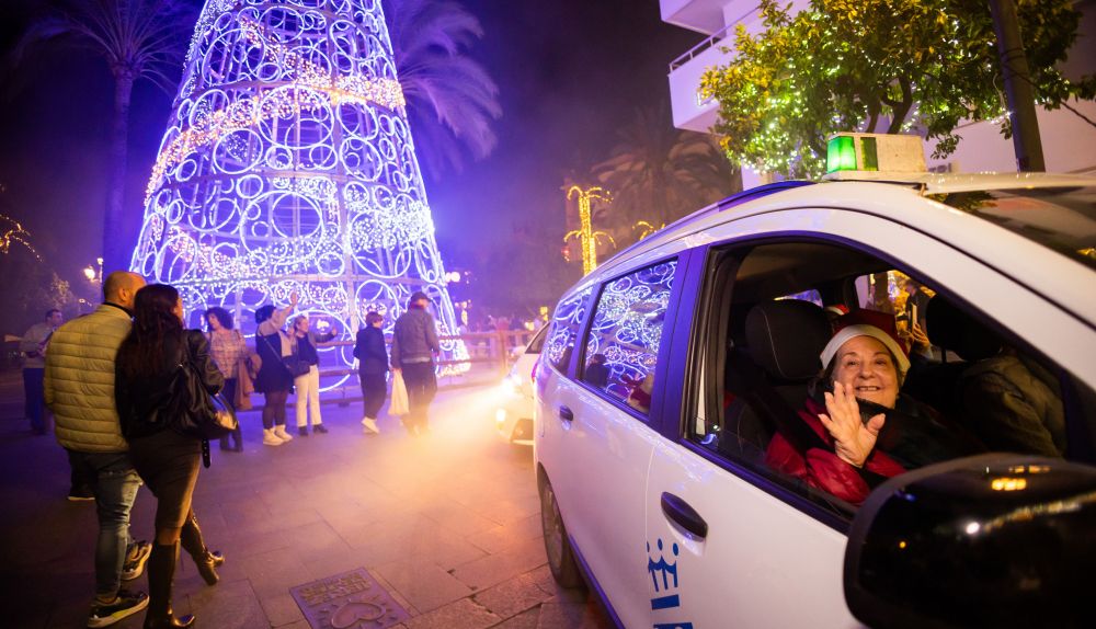No fue esa la causa. Se trataba del acto solidario del colectivo de taxistas de Jerez, que un año más lleva a las personas mayores al centro para que disfruten de la Navidad que se dibuja en el alumbrado, en las fachadas. Todo para que pudieran palpar en directo eso que han visto en diferido en sus residencias o ni siquiera eso y que ahora les descubrieron.