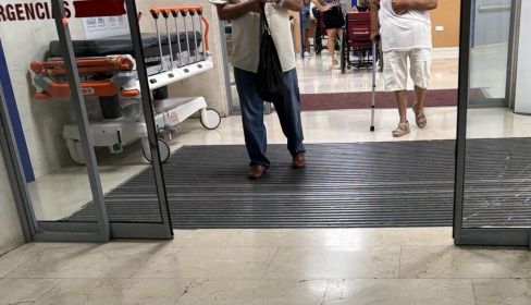 En el interior, las salas de espera tanto de pacientes a los que van llamando como de familiares acompañantes están muy llenas. Incluso alguna gente está en sillas de playa fuera, a cuenta de que dentro hay mucha presencia, si bien quedan sillas libres.