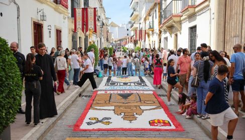 Mientras los cultos se desarrollaban, los jóvenes continuaban con su labor artística. Al filo de las 14 horas, las alfombras de sal estaban casi terminadas, dejando un paisaje visual impresionante justo cuando las puertas de la iglesia conventual se cerraban temporalmente, a la espera de su apertura para la esperada salida procesional.