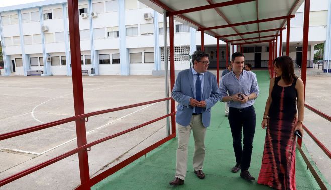 Los delegados municipales del Ayuntamiento de Jerez Jaime Espinar y José Ángel Aparicio han realizado una visita técnica, acompañados por la directora del CEIP Las Granjas María José Parejo, a la zona de obras del centro educativo para supervisar técnicamente el acabado de una pasarela cubierta planteada desde hace años por el colegio.