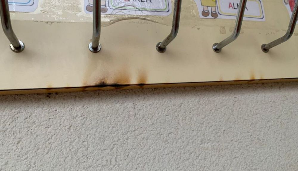 Además del deterioro que han causado al mobiliario escolar, también han intentado arrancar el celofán que mantiene las etiquetas de los nombres pegadas a las perchas. Una vez acometidas las fechorías, según se ver en una de las fotos, han tirado papel quemado a la alcantarilla, que también presenta desperfectos por la inflamación de los agujeros.
