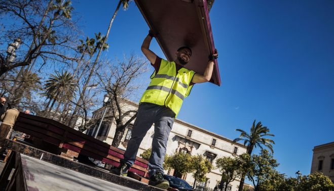 La empresa jerezana Gesmacont ha iniciado el montaje de las estructuras de palcos y tribunas para la Semana Santa. Como es habitual, este trabajo ha comenzado en la Alameda de Cristina donde se pueden ver descargado todo el material así como parte de la instalación ya iniciada.