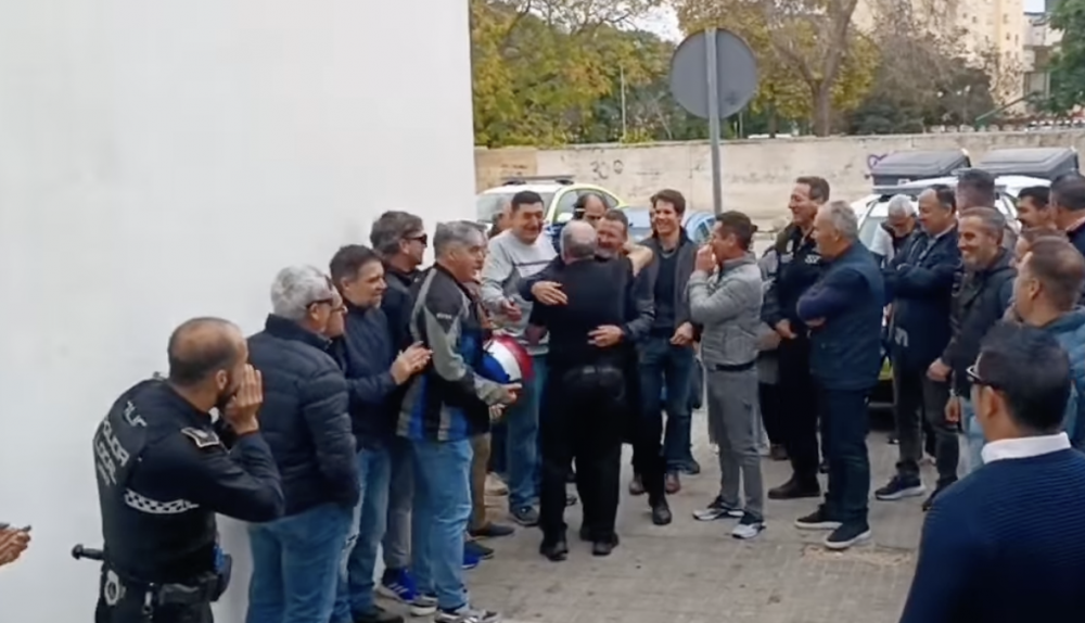 Con sirenas de los coches de la Policía, con abrazos, risas, lágrimas y hasta cánticos entonando "hemos venido a despedirte", han mostrado un gran cariño al camarero jubilado.