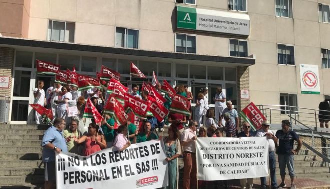 Con el objetivo de denunciar los recortes en las contrataciones, el sindicato provincial de Sanidad y Sectores Sociosanitarios de CCOO de Cádiz se ha concentrado a las puertas del Hospital de Jerez.