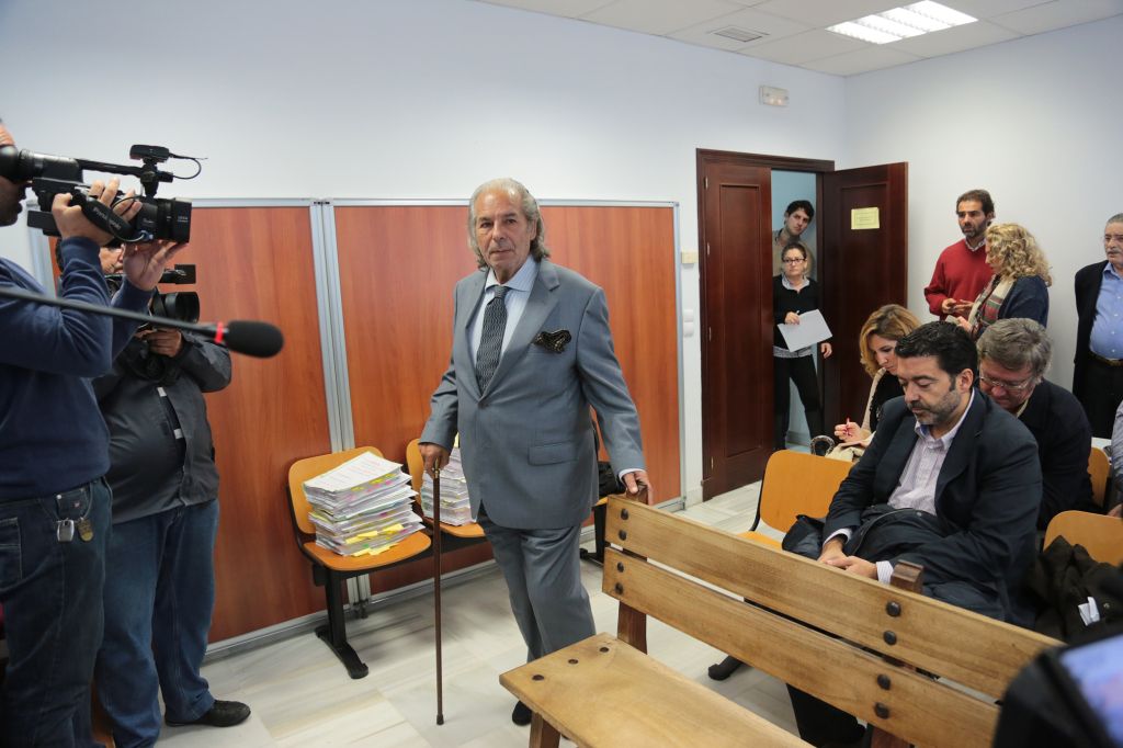 Llegaba Rafael de Paula al edificio de la Audiencia en taxi, poco antes de las 10 de la mañana. Para tranquilidad de sus seguidores, que alguno hubo, Rafael dejó en casa su toalla blanca, esa que se coloca en los últimos tiempos al cuello, para, al contrario, lucir impecablemente vestido: traje gris, camisa y corbata a juego y pañuelo marrón en el bolsillo superior de la chaqueta. Con dificultad para moverse, debido a su delicado estado físico, echó mano de su bastón -con un toro en su empuñadura, como no podía ser de otra manera-, y del brazo de su letrado, Jesús Barea, para acceder al edificio de la avenida Álvaro Domecq.