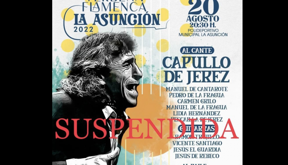 Quien ha corrido peor suerte ha sido la verbena flamenca del histórico barrio de La Asunción, que regresaba este sábado 20 de agosto. Con Capullo de Jerez como cabeza de cartel —un artista antaño fijo en los carteles de la Fiesra de la Bulería, que este sábado tendrá como principal protagonista a El Pipa—, la Asocación Cultural 'Nuestro Padre Jesús de Nazaret' ha comunicado a través de sus redes sociales la suspensión del evento, previsto en el polideportivo de la flamenca barriada de La Asunción.