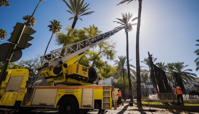 Este jueves, operarios municipales de Parques y Jardines han procedido a la poda de las palmeras de la Alameda de Cristina, que debido a la gran altura de algunas de ellas, ha sido precisa la intervención de al menos dos camiones con escalas de los bomberos para poder alcanzar la copa de estos ejemplares.