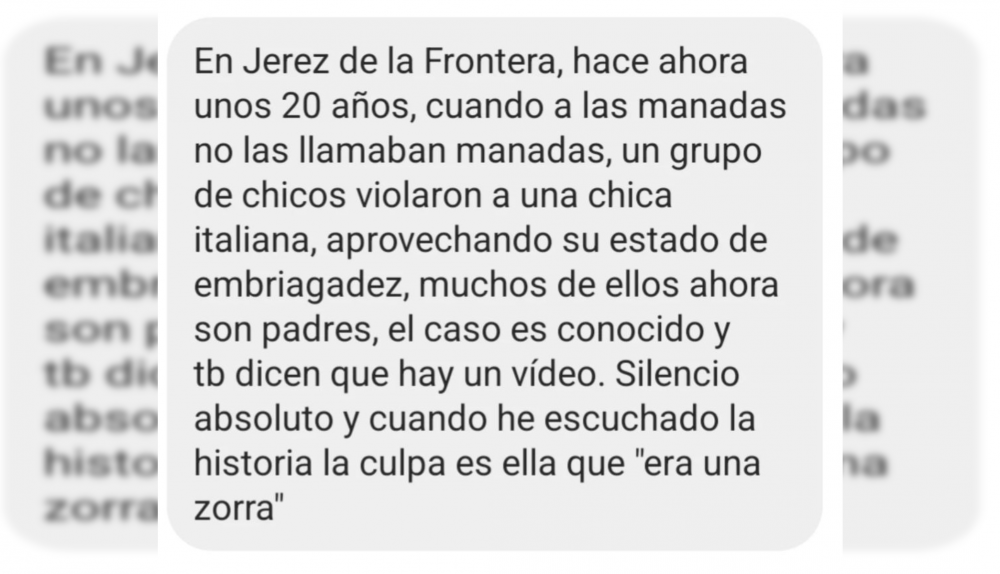 Es el caso de una chica que ha recordado cómo hace 20 años en Jerez de la Frontera "cuando a las manadas no las llamaban manadas, un grupo de chicos violaron a una chica italiana, aprovechando su estado de embriaguez, muchos de ellos ahora son padres, el caso es conocido y también dicen que hay un vídeo. Silencio absoluto y cuando he escuchado la historia la culpa es de ella, que era una zorra", explica esta publicación de Fallarás, el domingo por la tarde.