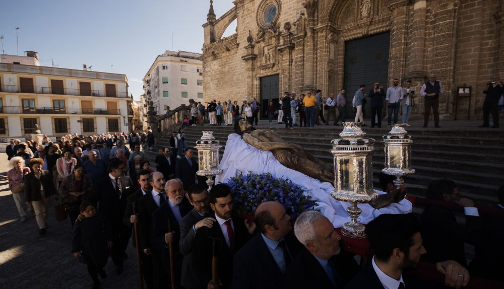 El Cristo de las Aguas de Jerez ha sido trasladado durante la mañana del sábado a la Catedral para intentar invocar a las lluvias y acabar con la sequía que afecta a todo el país. A las 12 horas se ha celebrado una misa oficiada por el obispo y a las 13.15 horas se ha procedido con el traslado de regreso de la imagen a San Dionisio, su templo. A destacar, la afluencia de personas en la Catedral. También han estado medios nacionales como Telecinco.