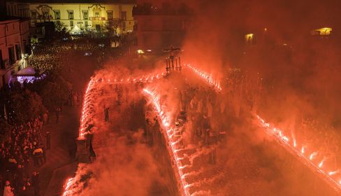 Aunque no lo parezca, hace cien años hermandades como La Coronación ya usaban estas bengalas para generar un efecto imborrable entre el público al fervoroso paso de sus titulares. Un siglo después, es La Viga la que ha hecho de esta tradición un elemento singular y atractivo que cada Semana Santa atrae a más propios y extraños a una recogida que, paradójicamente, destacada por su sobriedad.