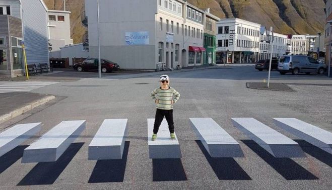 Esta señalización horizontal tridimensional, que parece estar flotando sobre el pavimento, pretende incrementar la seguridad gracias al efecto que provoca en los conductores y que estimula la frenada instintiva para mayor seguridad de los viandantes.