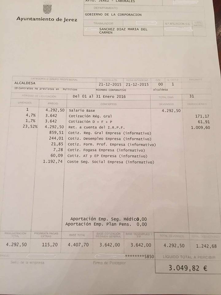 ¿Cuánto cobra la alcaldesa de Jerez? La duda la ha resuelto ella misma publicando en redes sociales la primera nómina que ha cobrado del Ayuntamiento desde que lo dirige, allá por junio del año pasado. Hasta diciembre estuvo como diputada en el Congreso, por lo que el primer sueldo que ha percibido de las arcas municipales, el del mes de enero, es de 3.049,82 euros netos, 4.292,50 euros brutos.