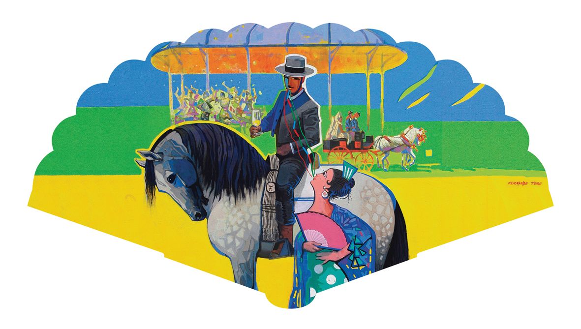 Adaptado de un cuadro presentado por el pintor para competir por el cartel oficial de la Feria del Caballo hace algunos años, representa prácticamente todos los elementos que componen la fiesta. “Es un cuadro muy feriante y en el que creo que se representa la Feria a la perfección, por lo menos lo que yo he vivido”, explica el artista. El caballo, el jinete, la flamenca, el coche de caballos, el jaleo del templete, pero sobre todo se representa el diálogo de los dos personajes centrales, “un diálogo que está lleno de colores, porque yo entiendo que entre él y ella lo que hay es algo mágico, algo maravilloso. No están hablando de Bárcenas ni de esas cosas por el estilo, sino de cosas muy bonitas, de la primavera”.En el cuadro priman fundamentalmente tres colores: el verde, el azul y el amarillo. “Como cartel que es, simplifiqué los colores, los puse planos, y son muy controvertidos ese verde, amarillo y azul que de alguna forma me persiguen mucho, sobre todo el amarillo y el azul, ya que son constantes en mis cuadros”, explica Fernando Toro, aclarando que eso se debe a una mera “cuestión de gustos, no es algo premeditado”.
