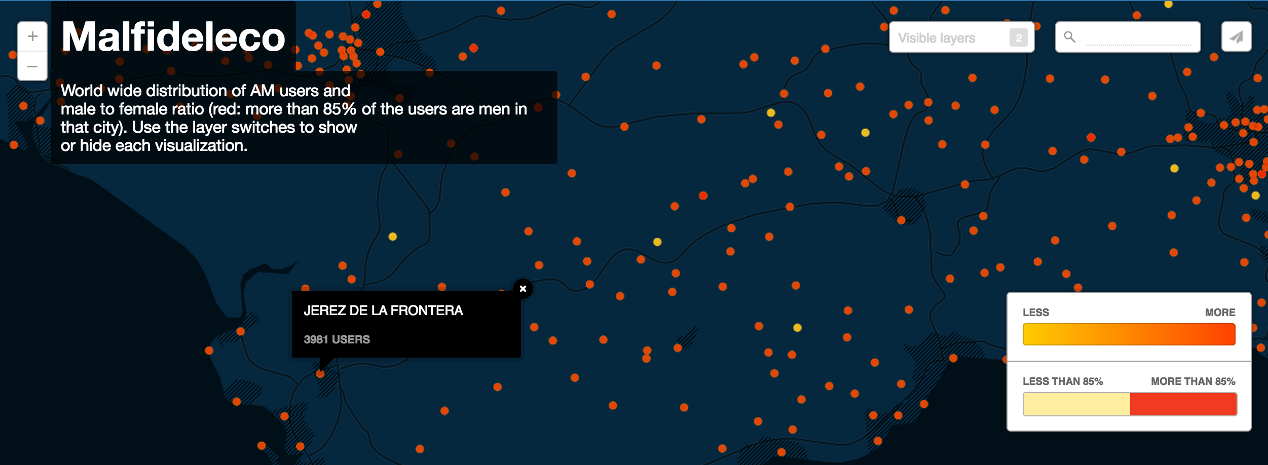 El mapa que acompaña a esta información le ha costado a Tecnilógica unas ocho horas de trabajo con la herramienta CartoDB, con la que han elaborado este mapamundi de la infidelidad. Eso sí, se han cuidado de no dar ningún dato que pudiera relacionar las cifras con usuarios concretos. “Borramos los datos de los usuarios de ciudades poco animadas para evitar el efecto: te hemos pillado porque eres el único usuario de Ninguna parte del Arroyo”, explica la empresa en su web. Al trabajo lo han llamado Malfideleco, que significa infidelidad en esperanto.