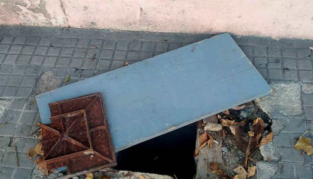 La tapa metálica que estaba anteriormente está visiblemente oxidada y rota, y ha sido sustituida o cubierta parcialmente con la referida tabla de madera, más grande y poco segura.