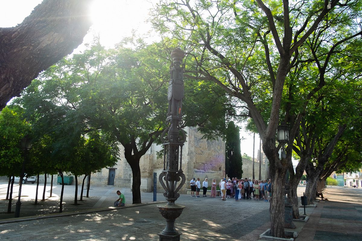 "Esta mañana hemos estado en el espectáculo de los caballos andaluces en Real Escuela", dice uno de ellos, que deseaba visitar el Alcázar de Jerez y no ha podido. "Luego hemos estado en González-Byass, no hemos tenido tiempo", comenta otro de su grupo. Se van a perder la edificación almohade mejor conservada a este lado del Estrecho pero no tienen otra. Al menos todavía tienen tiempo de ir a San Miguel y a la Catedral, que hasta las ocho de la tarde está abierta. Mientras tanto, pasean por la Alameda Vieja. Unas líneas amarillas pintadas en el suelo por el rastro y varios eventos que se hacen en este lugar, se encuentra entre el piso vencido. Las farolas de hierro de forja están oxidadas. Algunas de ellas ni siquiera tienen su parte superior.