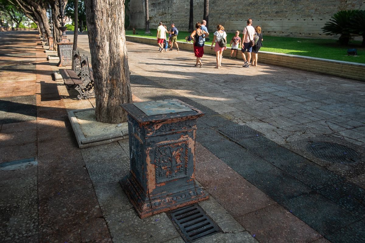 Un grupo de turistas pasea junto al lado de una farola de forja destruida y oxidada. FOTO: MANU GARCÍA.
