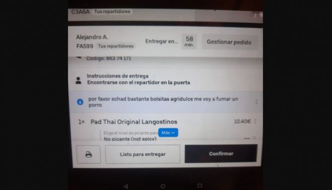 El cliente en cuestión, que indicó en las instrucciones de entrega que iba a encontrarse con el repartidor en la puerta, había pedido un Pad Thai Original Langonstinos. Pero esto le parecería insuficiente y decidió añadir la curiosa petición.