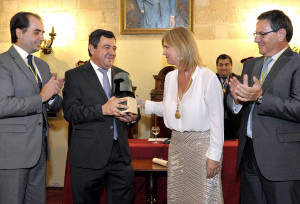 El presidente de Diputación, José Loaiza, recibe el premio Ciudad de Jerez de manos de la alcaldesa, acompañada de Saldaña y Villar.