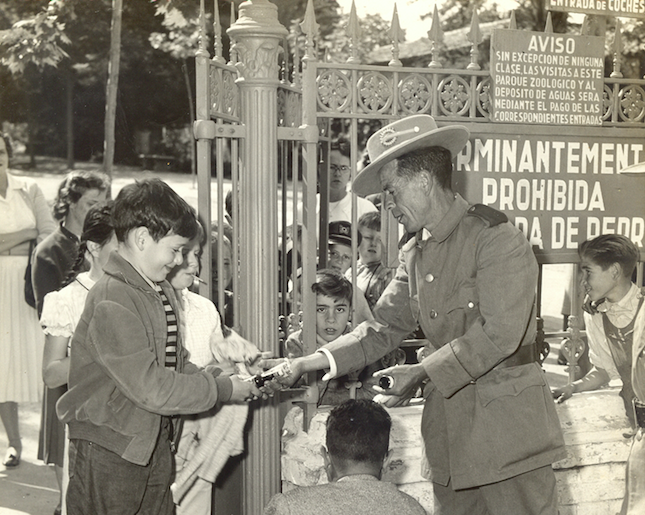 Un portero del Zoo, picando entradas a un grupo de jóvenes, en una imagen de hace medio siglo.