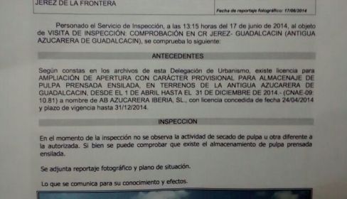 Los vecinos de Guadalcacín no aguantan más los malos olores procedentes de la antigua azucarera, que sigue almacenando pulpa de remolacha aún cuando desde el Ayuntamiento aseguraron hace unos días que "no se están realizando labores de secado de pulpa para las que sí se concedió licencia municipal el pasado año". Desde Foro Ciudadano desmienten estas declaraciones, ya que según Manuel Becerra, "hemos tenido acceso al acta de inspección de Urbanismo y pone de manifiesto que existe licencia para ampliación de apertura con carácter provisional para almacenaje de pulpa prensada ensilada, en terrenos de la antigua azucarera, desde el 1 de abril pasado hasta el próximo 31 de diciembre". El Ayuntamiento, por su parte, informa en una nota de prensa que Urbanismo no ha expedido tal licencia, sino que ha concedido "con carácter provisional, una ampliación de la licencia para el almacenaje de este producto".