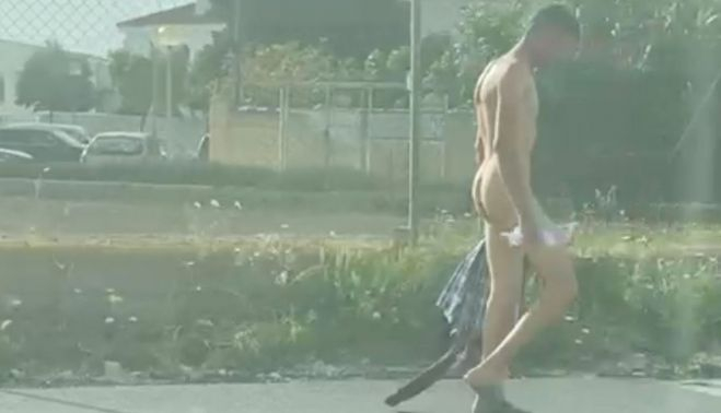 En la mano izquierda lleva al parecer la camisa y el pantalón. Avanza ajeno a las personas que incluso ralentizan la marcha para grabarlo. A su llegada a la población, sigue a lo suyo hasta que a la altura del cruce que dirige hacia la plaza Artesanía, es interrogado por agentes de la Policía.