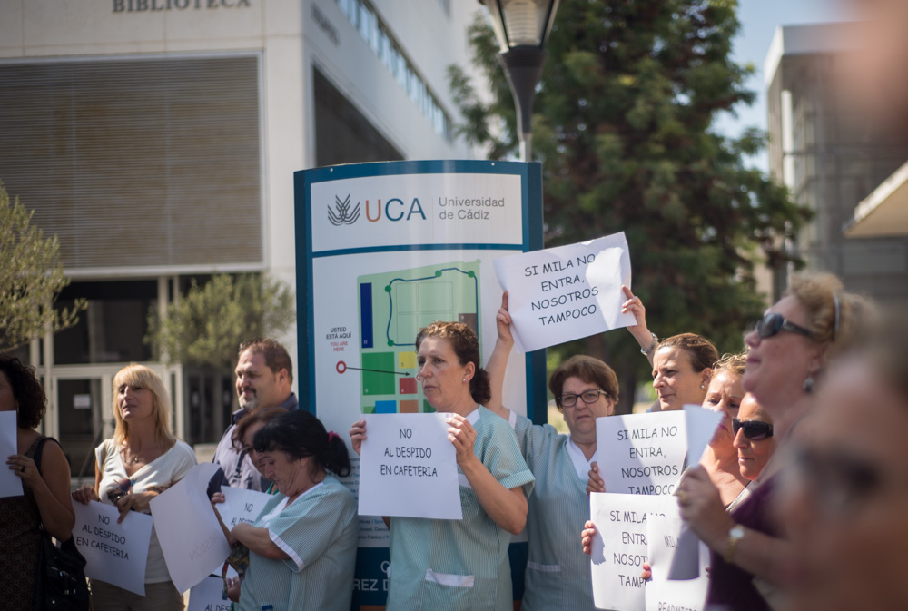 “Me han despedido por pedir mis derechos”, dice Milagros Padilla compungida y rodeada de compañeros que se suman a la protesta por su despido "improcedente". Mila, que lleva en su puesto cerca de 12 años, se entera de su despido hace apenas dos días. Le llega la carta de despido, con fecha del 15 de julio, y luego se percata de que le han ingresado el dinero de la indemnización en su cuenta bancaria. "Le han aplicado la reforma laboral pura y dura. Le han hecho un finiquito de lo más mezquino que hay”, declara Pepe Díaz, presidente del Comité de empresa del personal de la Universidad y capitán de la manifestación que tiene lugar en las puertas de la cafetería del Campus de Jerez.