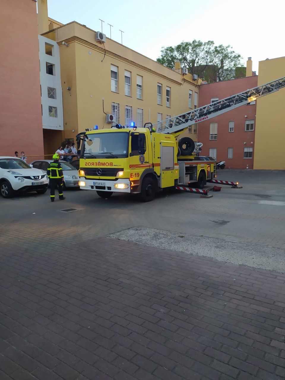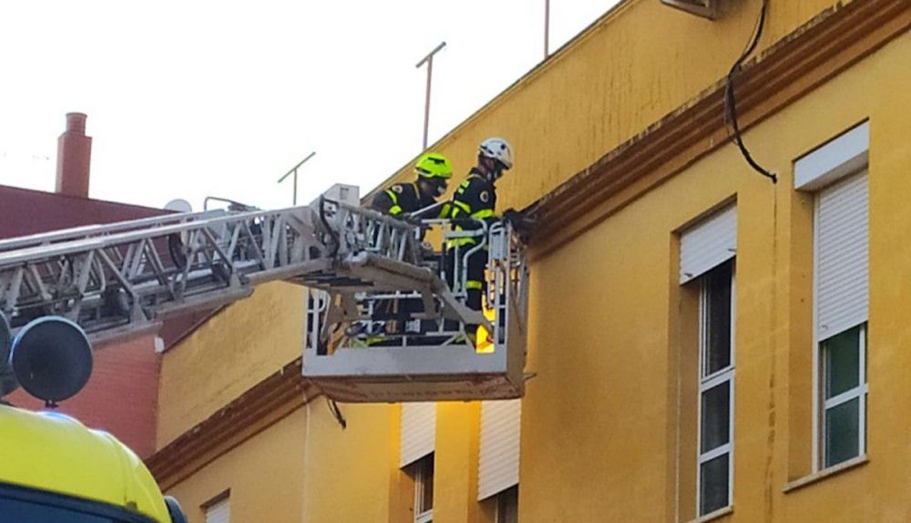 Dos bomberos se han subido a la plataforma para arreglar la cornisa que se ha desplomado. Afortunadamente, no se han registrado daños personales y la situación está bajo control. Según se puede observar en las fotografías, algunos vecinos se han asomado a sus ventanas para contemplar la intervención que se desarrolla esta noche en esta zona de Jerez. De momento, no ha trascendido el motivo que ha originado el desprendimiento.