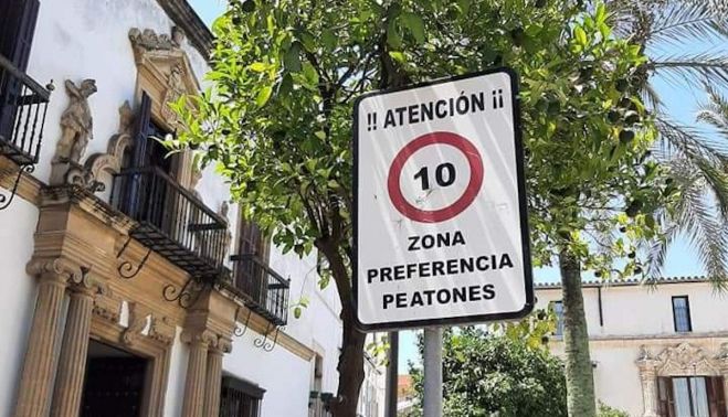 Alguanas señales de tráfico del casco histórico de Jerez indican que los vehículos deben reducir su velocidad a 10 kilómetros por hora al tratarse de una zona de preferencia para los peatones. Esta señaléctica lleva años formando parte del mobiliario urbano del centro, sin embargo, nadie se ha percatado de que el texto reproducido contiene un error ortográfico.