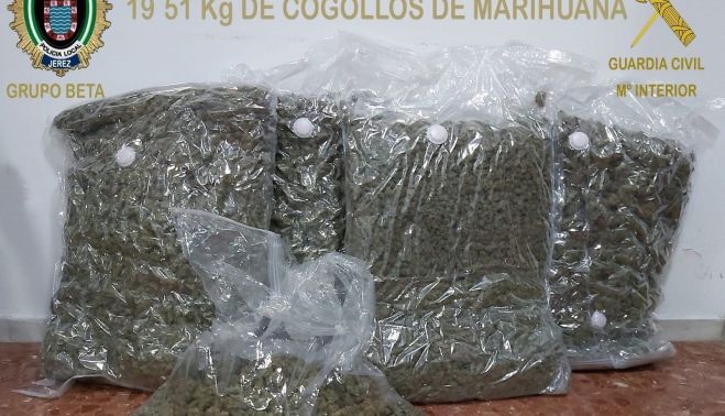 Agentes de la Policía local de Jerez y efectivos del Área de Investigación de la Guardia Civil han detenido a tres personas en la zona rural jerezana por un presunto delito contra la Salud Pública en una operación conjunta en la que se han intervenido 19,5 kilos de cogollos de marihuana, con una valoración de mercado aproximada de 100.000 euros.