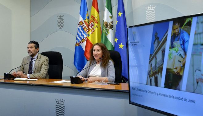 El Ayuntamiento presenta el primer Plan Estratégico del Comercio y la Artesanía de Jerez. La delegada de Turismo, Consumo y Comercio, Isabel Gallardo, acompañada de Luis Conde, socio directivo de la empresa Woower, ha presentado el documento, que el Consistorio cofinancia con la Consejería de Empleo, Empresa y Trabajo Autónomo.