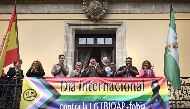 La alcaldesa, María José García-Pelayo, junto a Rafael Muñoz y Eduardo Coronilla, en representación de Jerelesgay, han colocado este viernes en la fachada del Consistorio la pancarta conmemorativa del Día Internacional contra la LGTBIQAP+fobia. El Ayuntamiento de Jerez ha acogido un acto reivindicativo en la que se ha dado lectura al manifiesto de Jerelesgay, respaldado por miembros de la Corporación municipal, Consejo Local de las Mujeres, y representantes del tejido social de Jerez, “para visibilizar el compromiso de la ciudad con la sensibilización en igualdad para erradicar el acoso, la violencia, y cualquier forma de LGTBIQAP+fobia”.
