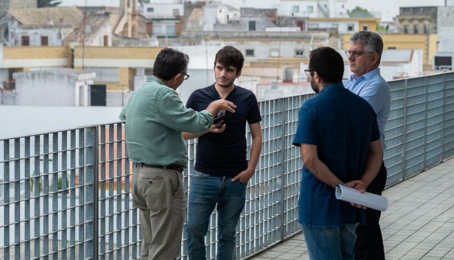 A su lado, el abogado Sebastián Olmedo, miembro del equipo de redactores de Manuel Ángel González Fustegueras, y Antonio Figueroa, geógrafo, consultor ambiental y activista, le acompañan en lo alto de un edificio de viviendas del centro histórico de la ciudad, desde donde se divisa todo el intramuros jerezano, un lugar donde hoy viven poco más de 4.000 personas. "Esto iba a ser un hotel, cuando lo de la Expo del 92, pero al final la sociedad quebró", explica uno de ellos en una promoción de vivienda de protección oficial (VPO) que difícilmente podría repetirse en el día de hoy.