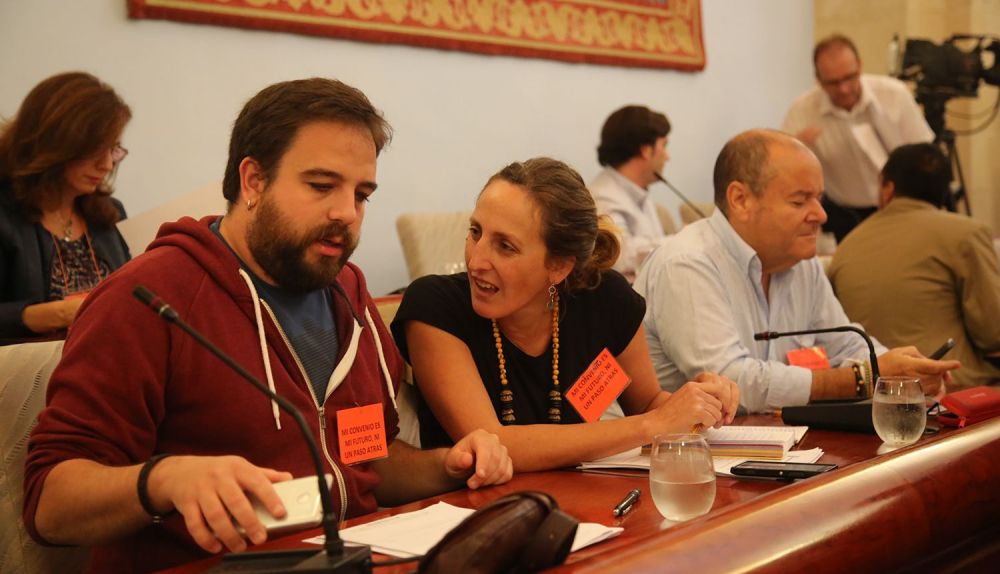 Los cinco ediles de Ganemos y los dos de IU lucen durante el pleno unas pegatinas, de color naranja, que llevan en el pecho. En ellas se puede leer: “Mi convenio es mi futuro, ni un paso atrás”. Como se puede deducir, se refiere a la lucha que mantienen desde hace una semana los trabajadores de la vid con la patronal, Fedejerez, a la que piden que las grandes bodegas firmen el nuevo convenio, en el que piden que se descongele el plus de antigüedad —paralizado hace cinco años— y la bolsa de eventuales. El apoyo no queda en las pegatinas, estos dos grupos, luego, llevan por urgencia una moción para pedir a la Corporación que defienda a estos trabajadores, algo que hacen el resto de formaciones sin excepción.