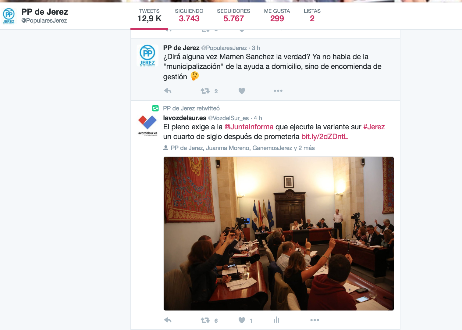 lavozdelsur.es, como suele hacer en cada pleno, ha ido publicando las decisiones adoptadas por los grupos municipales durante toda la jornada. En Twitter, con la etiqueta #PlenoJerez, se publica lo que va dando de sí la sesión plenaria, que suele tener buena respuesta por parte de nuestros seguidores. Lo que no es tan habitual es que nos encontremos con un retuit —compartir un mensaje en tu propia cuenta— del Partido Popular jerezano (@PopularesJerez). Aquí queda nuestro particular homenaje al community manager.
