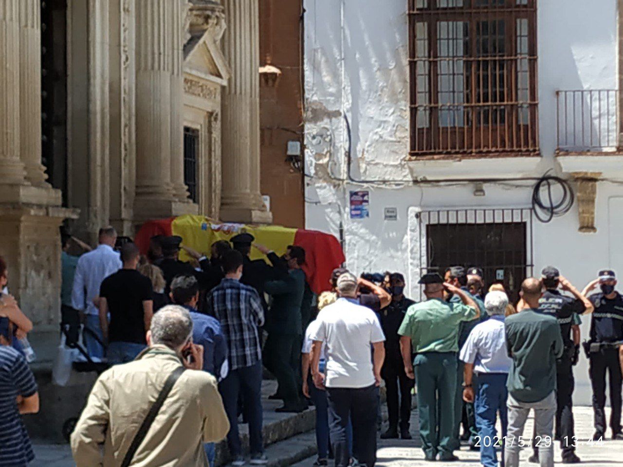 Varias personas se han acercado a la capilla ardiente para acompañar al ataud donde yace el hombre de 52 años que deja a una viuda, a su hija y a tres nietos. El féretro ha sido transportado hasta el antiguo ayuntamiento jerezano donde le esperaba un grupo de familiares, amigos y compañeros formando un pasillo.