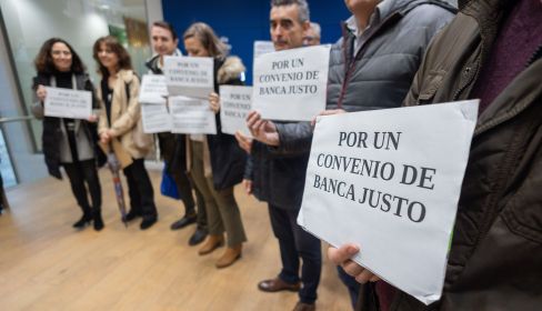 "Por un convenio de banca justo" decía uno de los carteles de los trabajadores de BBVA, que también protestaban "por una subida real de salarios, no absorción", solicitando "la recuperación del poder adquisitivo". También pedían "no a la movilidad de 50 kilómetros".