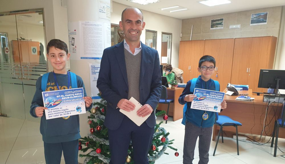 Ambos han sido los encargados de entregar a Abel Pichaco Gómez, alumno del colegio Federico Mayo, y a David Lorenzo Núñez de Souza, del colegio Arana Beato, su premio por haber resultado finalistas del concurso convocado a nivel nacional, consistente en una tarjeta para material deportivo de 30 € cada una.