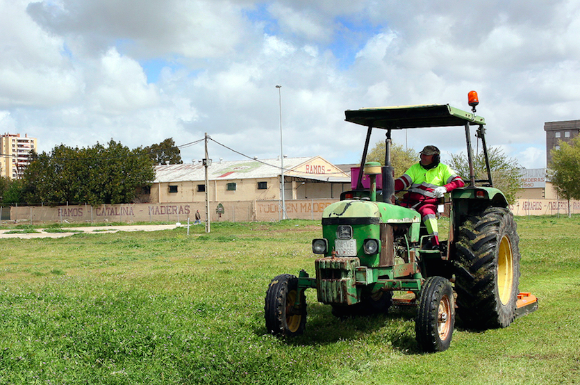El Ayuntamiento de Jerez ha iniciado una campaña para desbrozar y limpiar un centenar de solares municipales en los siete distritos en los que se divide la ciudad. El presupuesto para estos trabajos, que se prolongarán por espacio de cuatro meses, es de 20.300 euros y han comenzado en los alrededores de Chapín, en la parcela que ocuparán los feriantes durante la próxima Feria del Caballo. El objetivo de este plan es evitar el riesgo de incendio que traerán las altas temperaturas en las próximas semanas y reducir la presencia de insectos y roedores.