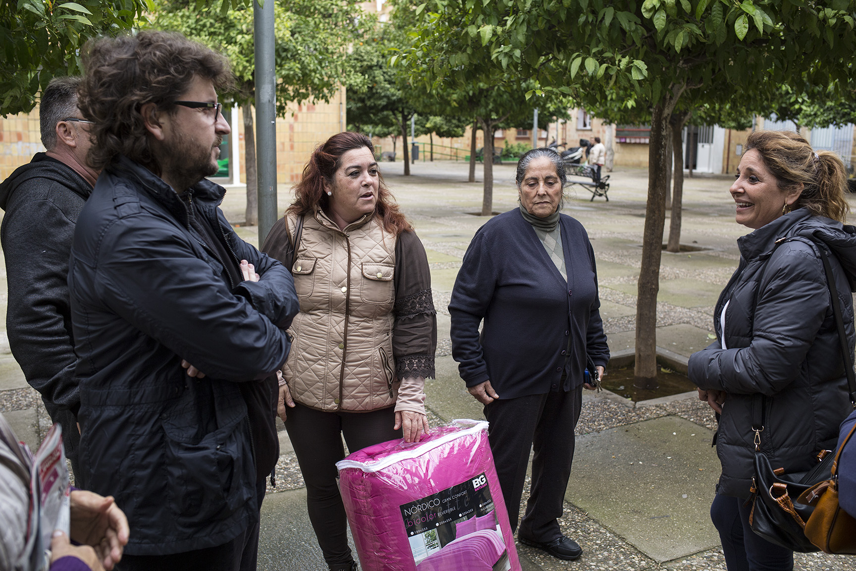 “¡Sin techooo! ¡Dame trabajooo!”. El grito lo pega un vecino de plaza Ronda que ya pasa de los cuarenta años. “Pero si ni yo tengo ahora trabajo…”, nos comenta Juan, que enseguida acapara la atención de los presentes, entre ellos Rafael, que se le acerca para felicitarle. Parado desde hace diez años y sobreviviendo a base de chapuzas, hizo de figurante en la película, pero aún no ha podido verla. “No tengo dinero para ir al cine”, explica. Sin moverse del mismo enclave que refleja el film, Rafael bien podría haber sido protagonista de una cinta parecida. “Mi día a día es echarle una mano a mi vieja, y así pasan los días y las semanas desde hace diez años. Tengo 47 años y un porvenir muy negro”, lamenta.