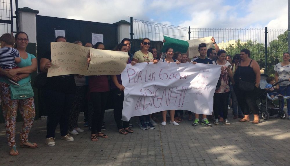 “No nos escuchan”, dicen los padres de alumnos de tres años del CEIP Federico García Lorca, de la zona Sur, que reclaman el mantenimiento de las dos líneas de Infantil de tres años para el curso que viene. Tras cerrarse el plazo de matriculación hay 26 niños inscritos, dos de ellos con necesidades educativas especiales, por lo que no llegan a los 28 que se exige para contar con más de una clase.