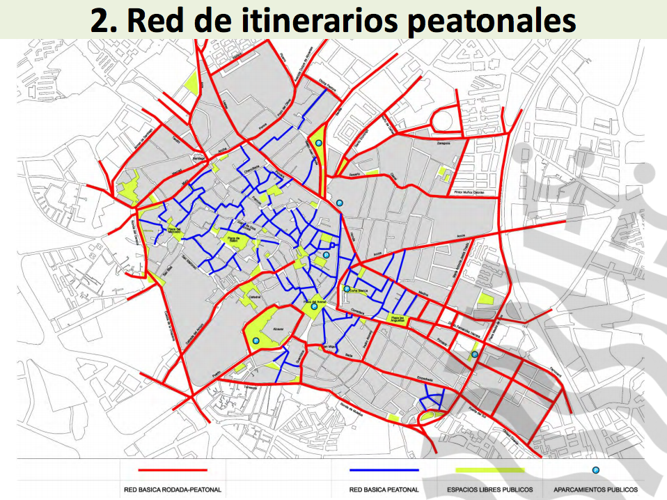 En segundo lugar, se propone la creación de una red de itinerarios peatonales, que tiene una doble vertiente, como ha explicado Benito García: “por un lado, se aprovecha la red de vías básicas que tienen capacidad suficiente para compartir el uso rodado y peatonal, como ocurre con calles como Arcos, o Medina”. Y por otro, se contempla la creación de una red de calles peatonales que estará situada principalmente en la zona de Intramuros. “Con esta red damos prioridad absoluta al peatón y además, conseguimos unir los principales puntos de atracción de la ciudad, tanto espacios libres, zonas de ocios, monumentos o equipamientos”, tal y como ha explicado el director de Urbanismo.