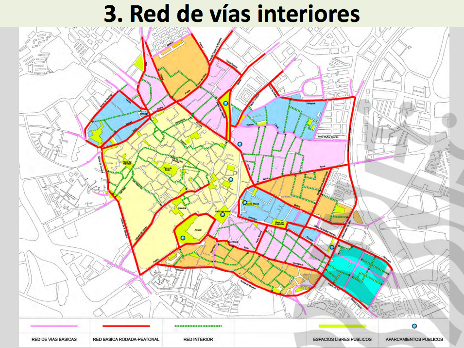 En tercer y último lugar, la propuesta contempla la configuración de una red de vías interiores, cuyo uso se reserva en exclusivo para residentes de una zona concreta, vehículos de carga y descarga, taxis, bicicletas y vehículos de emergencia, “con lo que el tráfico que se produzca en esa zona sólo será de gente del barrio”, ha señalado el director de Urbanismo. “Esta red afianza la configuración del centro histórico por barrios, con lo que se potencia más la identidad de éstos con sus habitantes. Al reducir el tráfico rodado en determinados barrios —ha añadido— se reservan los aparcamientos disponibles para los residentes, mejorando de esta forma la habitabilidad”. En este caso, la velocidad máxima permitida será de 10 kilómetros por hora y el aparcamiento estará limitado a los residentes.