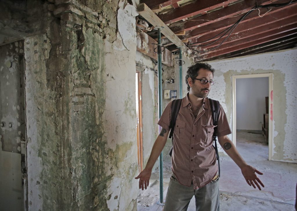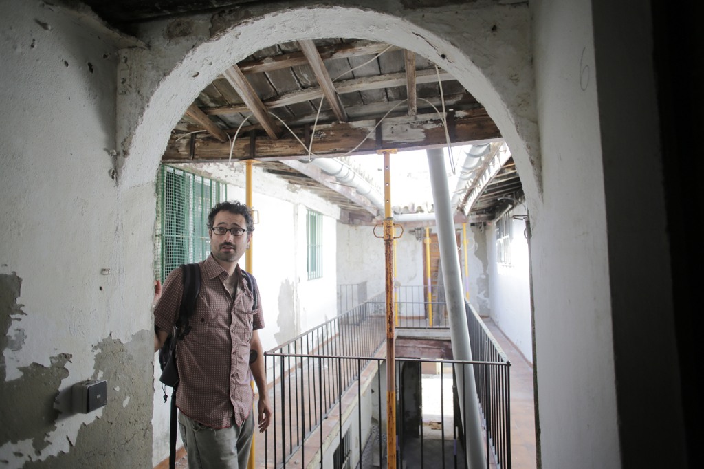 José Luis nos enseña más viviendas. La que había pertenecido a Juan y Emilia, otra en la que habitó una familia sólo unos meses y que destrozó paredes y suelos simplemente por hacer daño. Por último, nos enseña la que algún día espera que vuelva a ser su vivienda. Y es que tanto José Luis como sus otros dos compañeros llegaron a vivir aquí al poco de adquirir el corral. “Al principio estábamos bien, Juan y Emilia eran como nuestros abuelos, y nosotros para ellos, sus nietos. Había veces que se iban de turismo con el Imserso y nos traían algún regalito. Nosotros hacíamos lo mismo cuando volvíamos de algún viaje. Comíamos juntos, porque ella solía hacer comida para nosotros”, recuerda el joven. Sin embargo, los problemas de filtraciones y el riesgo de que algún cascote se cayera sobre alguien acabaron por hacer insostenible la vida en el corral. “Tiramos los falsos techos de escayola para ver el estado de las vigas, porque se colaba mucha agua. El suelo estaba lleno de tuppers de plástico para las goteras. De tanto esquivarlos esto parecía una prueba de Humor Amarillo”.