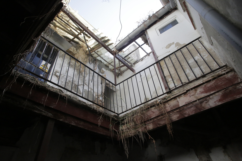 José Luis nos enseña más viviendas. La que había pertenecido a Juan y Emilia, otra en la que habitó una familia sólo unos meses y que destrozó paredes y suelos simplemente por hacer daño. Por último, nos enseña la que algún día espera que vuelva a ser su vivienda. Y es que tanto José Luis como sus otros dos compañeros llegaron a vivir aquí al poco de adquirir el corral. “Al principio estábamos bien, Juan y Emilia eran como nuestros abuelos, y nosotros para ellos, sus nietos. Había veces que se iban de turismo con el Imserso y nos traían algún regalito. Nosotros hacíamos lo mismo cuando volvíamos de algún viaje. Comíamos juntos, porque ella solía hacer comida para nosotros”, recuerda el joven. Sin embargo, los problemas de filtraciones y el riesgo de que algún cascote se cayera sobre alguien acabaron por hacer insostenible la vida en el corral. “Tiramos los falsos techos de escayola para ver el estado de las vigas, porque se colaba mucha agua. El suelo estaba lleno de tuppers de plástico para las goteras. De tanto esquivarlos esto parecía una prueba de Humor Amarillo”.