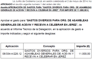 En total, casi 37.500 euros 'invertidos' por el gobierno del PP en ágapes, recepciones y reuniones de lobbys del vino en la ciudad que, por ejemplo en el caso de Recevin, apenas supone abonar una cuota anual de 500 euros para cumplir con una asociación que los propios populares llegaron a admitir que tenía "baja utilidad". Los reconocimientos de obligación de pago a los diferentes proveedores figuran en las actas de las juntas de gobierno local de 11, 21 y 24 de abril, mientras que para las asambleas hay dos partidas específicas libradas en la junta de gobierno de 2 de mayo. Un gasto de 7.000 euros para la celebración de las asambleas generales de ambas organizaciones, y otro de 11.000 euros para 'gastos diversos' derivados de la organización de dichas asambleas.